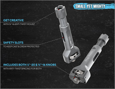 Whether you’re rigging a camera overhead, mounting to a vehicle, or securing an LED panel or monitor in tight spaces, CinePins deliver unmatched flexibility. Mount them directly to a camera cage, light, or accessory to unlock creative rigging possibilities that go far beyond the standard.