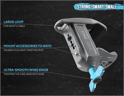 Most super clamps are heavy, clunky, and lack solid mounting points. CineJaws design considered every mounting angle and heavy-duty camera clamp you to mount accessories to NATO or ARRI-style anti-twist locations. Removable 3mm anti-twist pins are stored on the top jaw for mounting accessories to or through CineJaws with confidence.
